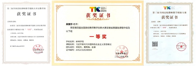 能力成果双向提升:近年学院培育省级教学名师3人、省级教坛新秀1人、蚌埠市十佳思政名师2人;青年教师在教学竞赛中表现突出,先后获全国高校教师教学创新大赛(安徽赛区)一等奖2项、全国三等奖1项,及安徽省高校教师教学展示活动二等奖、安徽省青年教师教学比赛二等奖等多项荣誉,教师教学能力与成果同步凸显。