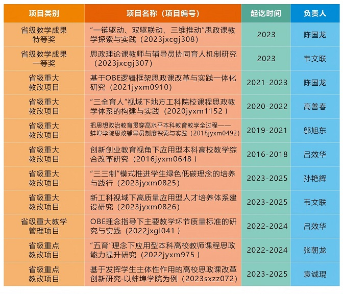 搭建特色科研平台:牵头承担“安徽省大中小学思政课一体化共同体”项目,统筹全省大中小学思政课一体化建设研究与实践;依托蚌埠市红色文化研究中心、美丽安徽建设研究中心,深耕区域特色研究领域;成功获批蚌埠市首届基层思想政治工作示范点,在习近平生态文明思想研究、红色文化传承两大领域形成特色优势,打造差异化科研品牌。