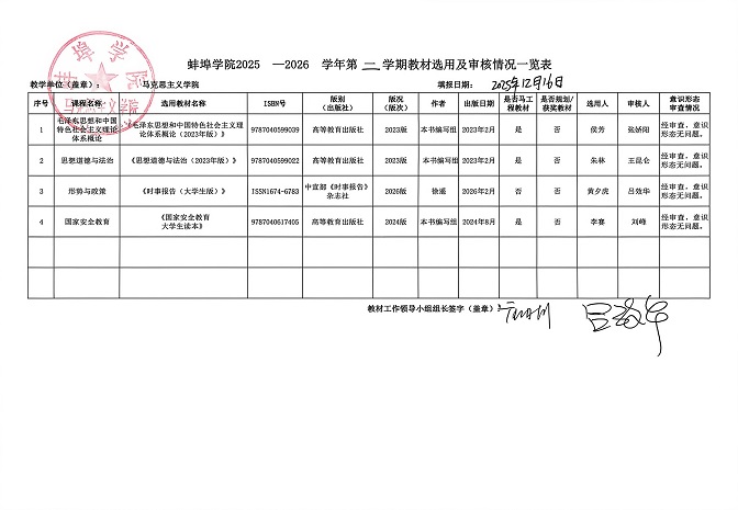按照《蚌埠学院教材管理实施细则》(院教字〔2021〕10号)要求,马克思主义学院对2025-2026学年第二学期教材开展了选用及审核工作,现将相关结果进行公示。